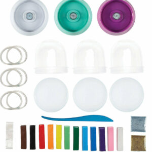 Light up their eyes with this deluxe snow globe kit. Three battery-operated bases have LED lights in three unique colors. Young artists can mold their own creations then oven-bake before assembling their globe. Choose from two different micro-glitter colors then light up the globes and shake for a magical display. Great for making gifts for loved ones or commemorating special occasions.