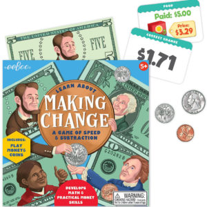 Making Change is an educational game where players use mental math to subtract the price of an item from the amount paid to make the correct change. Whoever collects the most items wins, get one item from each of 10 categories for bonus points. Making Change helps to build practical math skills. Includes 50 Item cards and play paper money and coins. From eeBoo for ages 5+