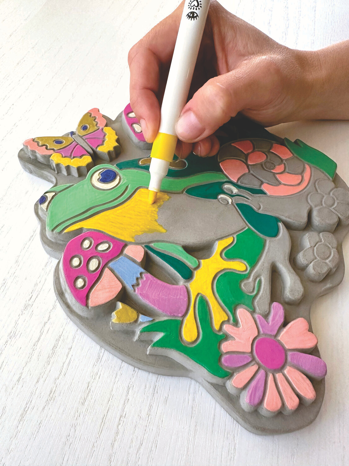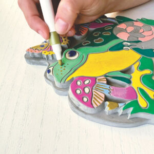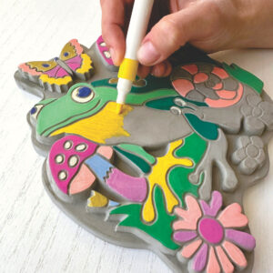 Decorate a stone for your garden with paint markers! Just follow the numbers on the marker caps to color in the cute garden scene featuring a friendly frog, snail, flowers and mushrooms. You can then layer your own details on top with the gold paint marker to make your art unique! Comes with 12 markers including gold and a sturdy garden stone.