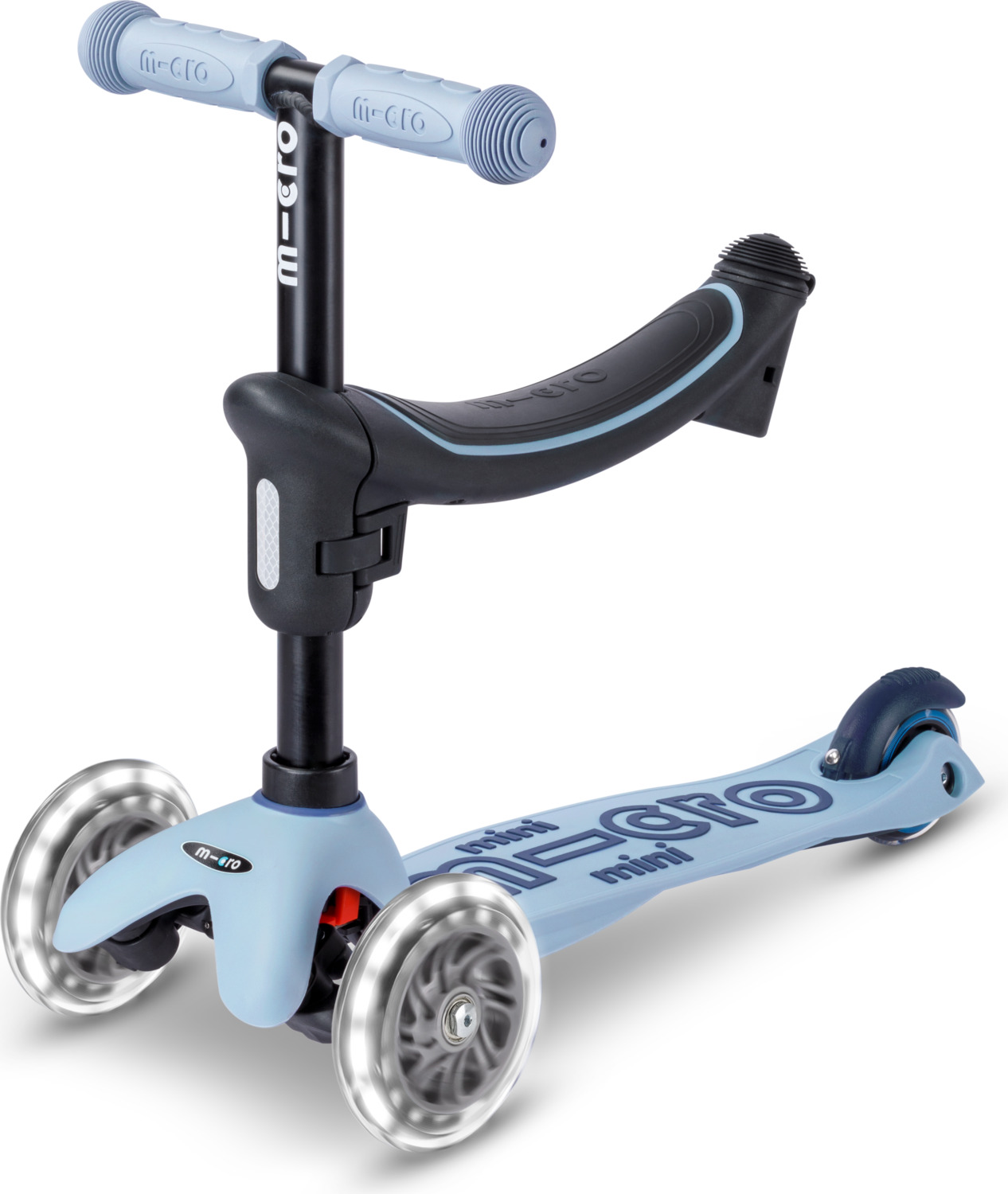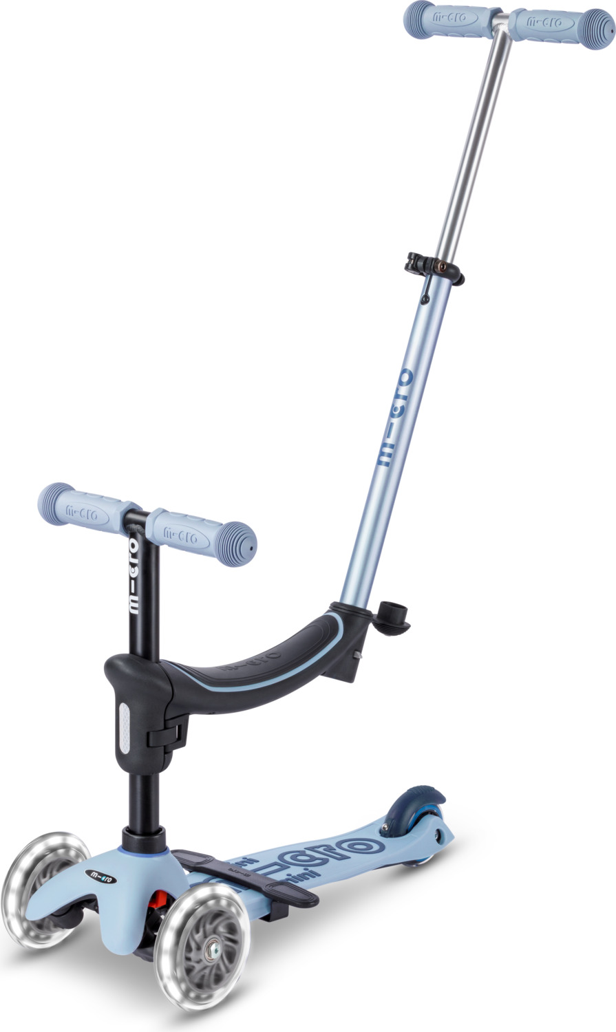 Stage 3: By moving the seat/T-bar combo to the Mini scooter base, kids can take their first ride on wheels—rolling forward while a parent provides support with the push bar.