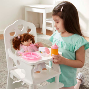 Every mommy knows how important it is to feed a little baby. Now, your little mommy can take care of her baby with this adorable 8-piece set. An easy-close, embroidered bib, keeps baby clean during mealtime which is organized with a divided dish, fork, spoon and yummy “applesauce” and “peas and carrots” for the baby. Disappearing “orange juice” and “milk” bottles add nutrition and fun!