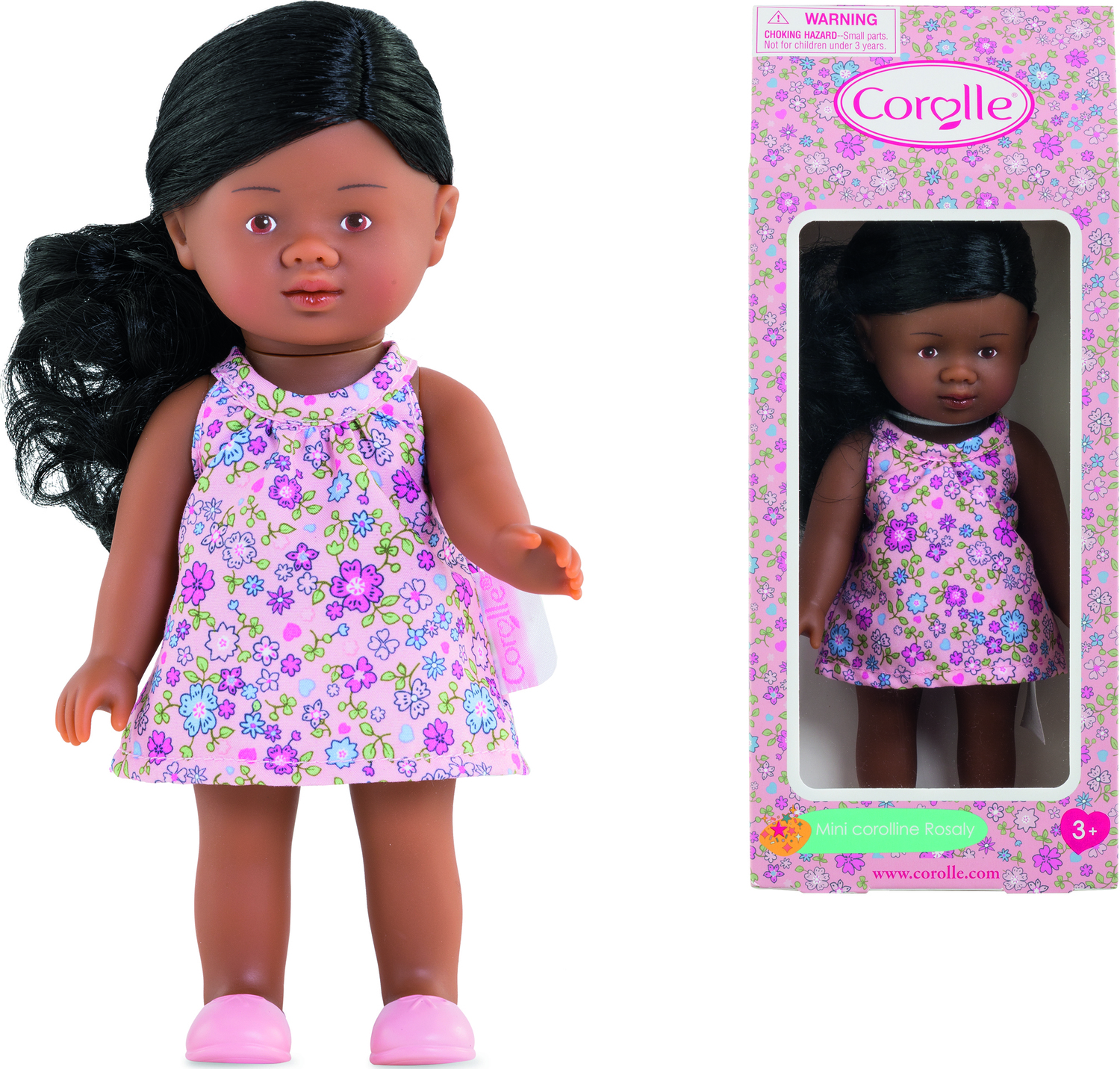 Mini Corolline Rosaly is a petite 8-inch doll ready to offer for any gift-giving occasion, with an all-vinyl body that is soft to the touch and delicately scented with vanilla, a Corolle signature. Rosaly has brown painted eyes and long dark hair. She’s dressed in a charming floral-print dress over underpants and matching molded shoes (not removable). Rosaly is the ideal size to slip into a bag or backpack and accompany your child all day long. Ages 3 and up.