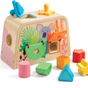 How do the colorful pieces fit through the holes? Curious toddlers will be fascinated as they discover 3 different ways to fit 8 geometric shapes into the matching holes on this gorgeously designed wooden sorting box. Little learners explore colors and shapes while honing their matching, grasping, and spatial recognition skills. To get all the pieces out, kids have to reach through big elastic cords on the back. We love the sturdy construction and cute koala illustration on the side!