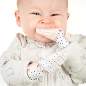 Malarkey Kids has combined the traditional anti-scratch mittens with the trademark Munch Mitt silicone cap technology to make for the perfect newborn anti scratch + chew mitts. One side of the double-sided flip top cap features soft, textured silicone for baby to suckle on, while the opposite side provides soft fabric to protect against scratches.