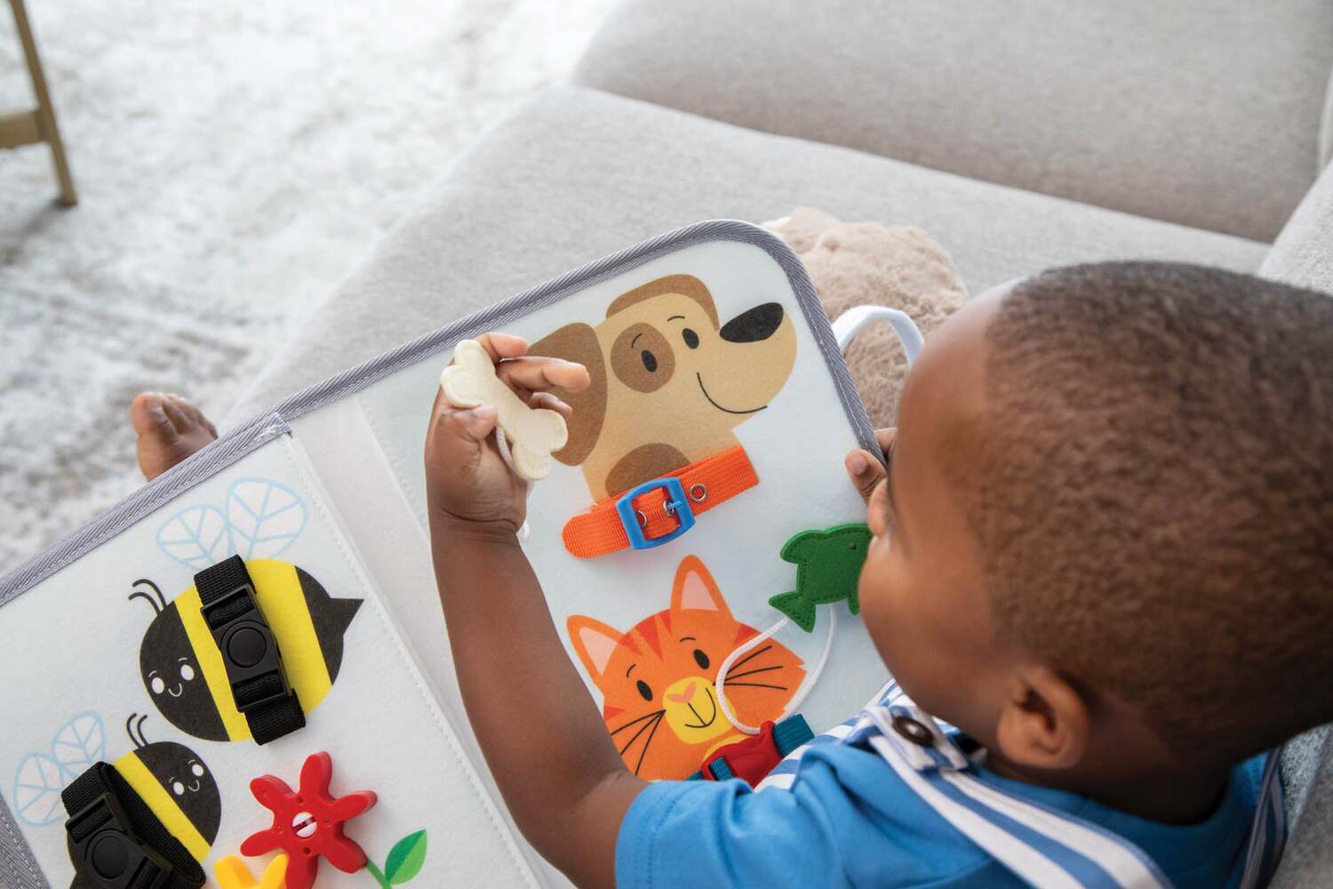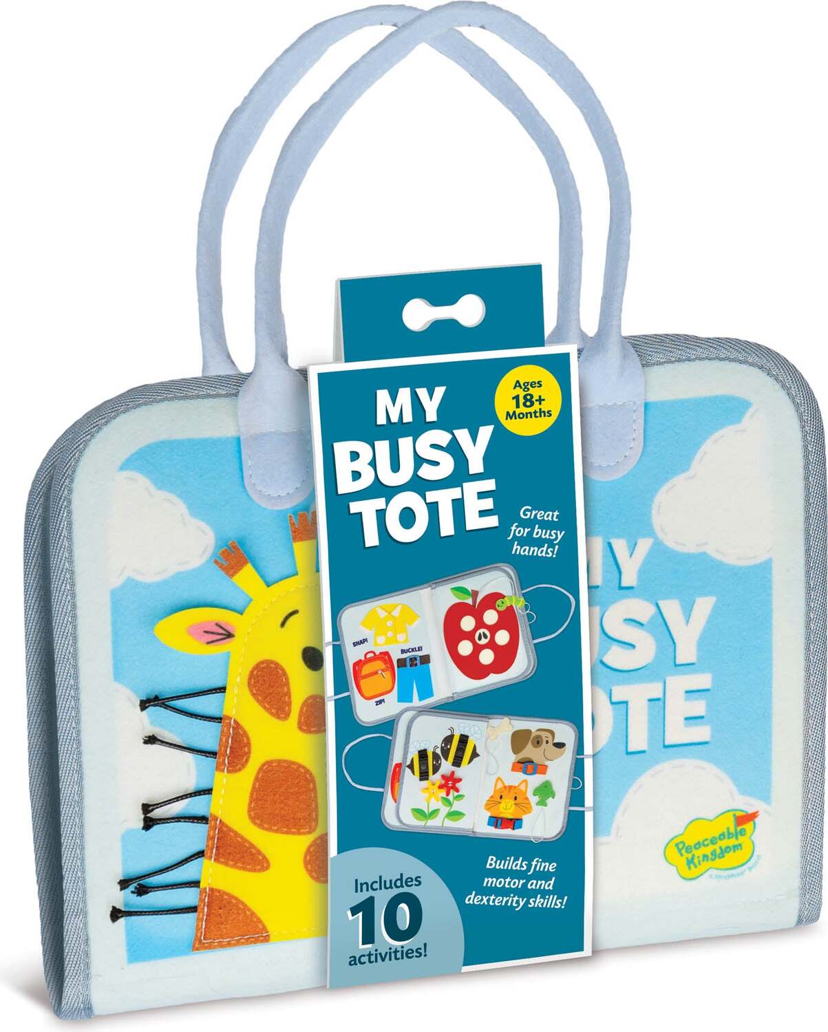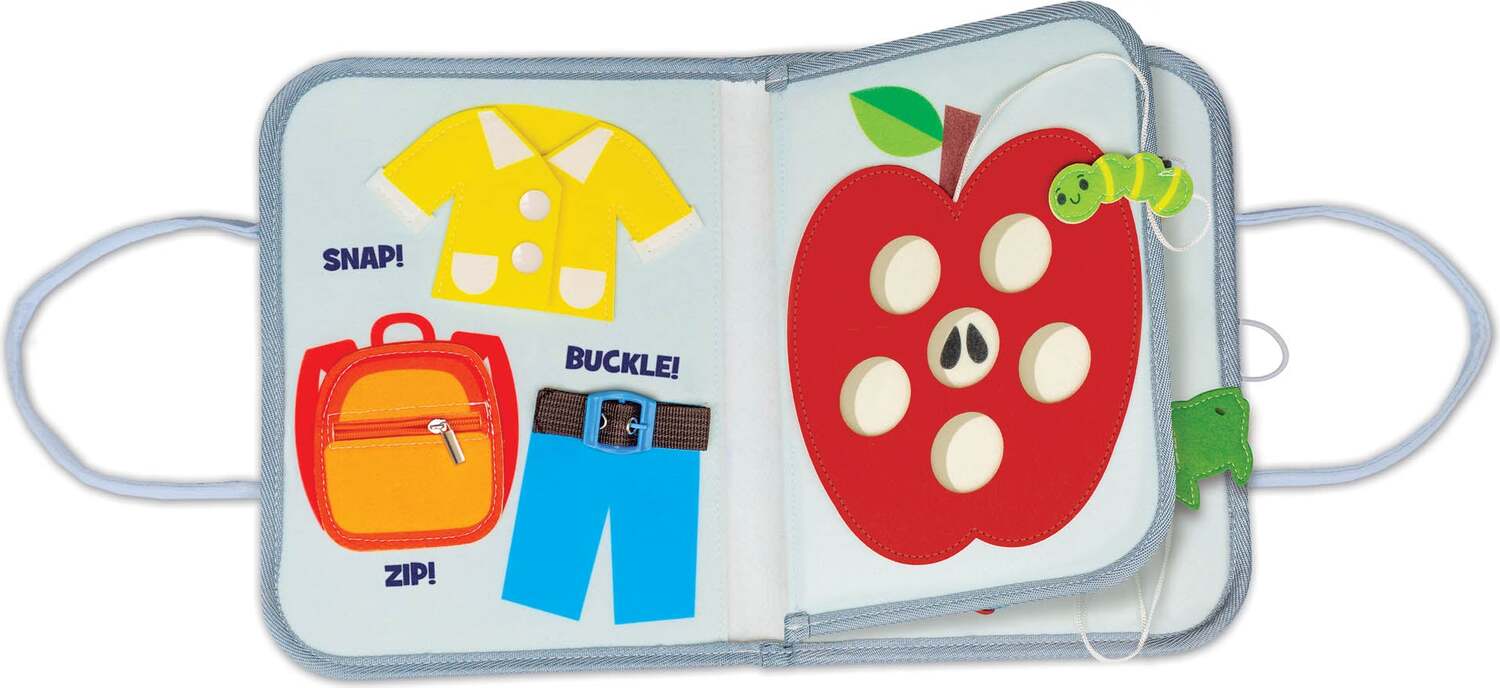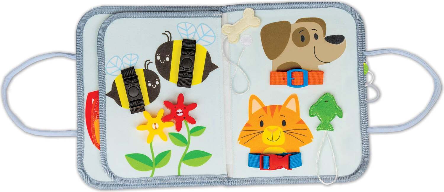 Thoughtfully designed to keep busy hands engaged, this activity tote turns gives little learners a fun, tactile way to build essential skills! Entertain toddlers with 10 hands-on fine motor activities on lightweight felt pages: snaps, zippers, buckles, spinners, pull tabs, threaders, and more! The bright, friendly designs include happy animals and familiar objects, and all the pieces are securely attached to the tote. Designed for ages 18 months and up, children can explore real-life tasks in a safe, sensory-rich way that encourages independence and strengthens early coordination.