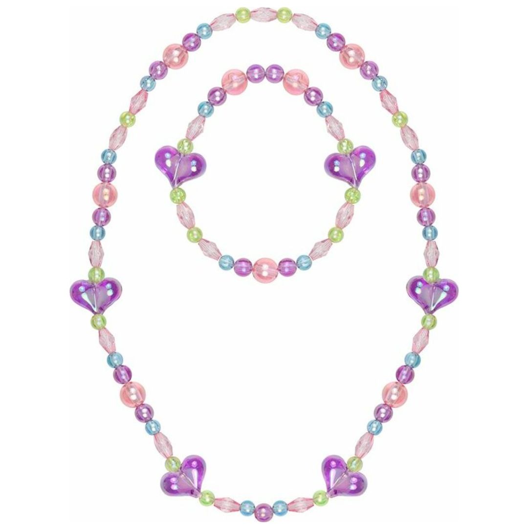 Your heart will go on loving this snappy 2 piece bracelet necklace set. Beaded on a stretchy elastic with a fun sequence of clear Colored beads and large hearts.