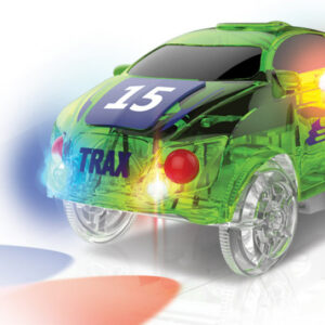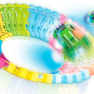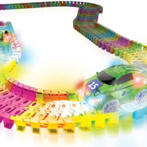 The excitement spills out before the box is opened. Out come 221 neon, glow-in-the-dark flexible track pieces that snap together in countless ways. Decorate the transparent racecar with the stickers and watch it leave a trail of light on the track. Requires 2 AAA batteries.