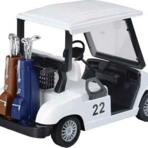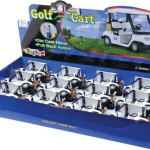 Two golf club bags are loaded into the back of this die cast Golf Cart. Pull back to watch these zoom around the greens. Made of metal and plastic. Item 5″ L. x 3″ W. X 2″ T.