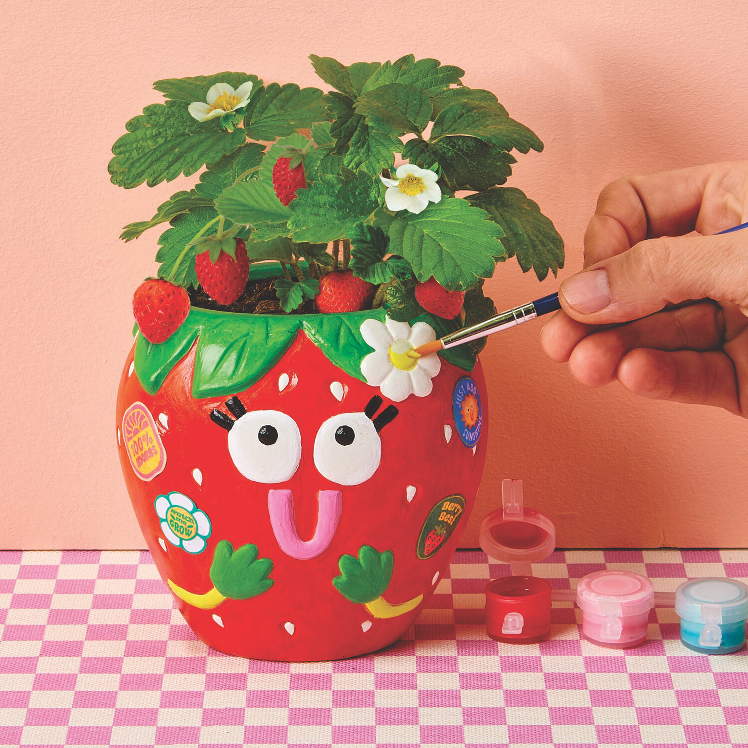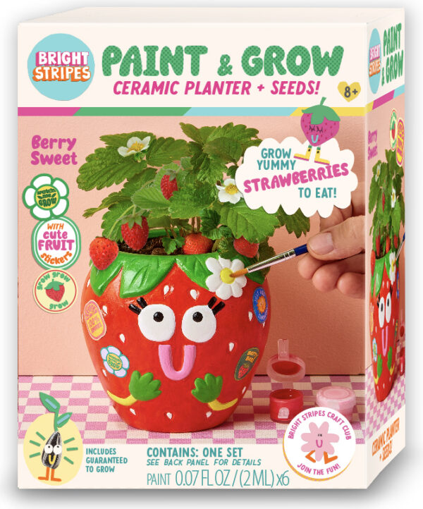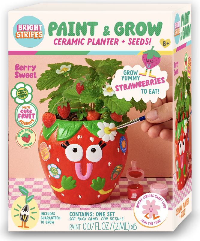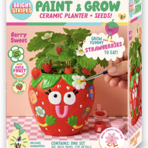 Bright Stripes Paint and Grow Berry Sweet Strawberry kit allows kids to use their paint brush and green thumb at the same time! It’s a painting set and gardening activity all in one! Paint a high-quality ceramic vase shaped as an adorable Sweet Strawberry character! Use the included paint brush and 6 high gloss paint colors and funny fruit stickers to decorate. Add the soil pellet into the vase, pour in water and watch the soil expand like magic! Plant your real live strawberry seeds!