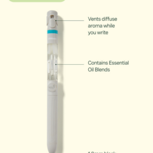 Elegant 1.0 mm ballpoint pen that transforms your journaling or notetaking into a beautiful sensory expreience by diffusing aroma as you write. Includes Essential Oil Blend four-scent cartridge from the Crisp Mountain Air scent family. Lower one – or multiple – of the vents at the top to create a unique, custom fusion. Includes one replacement ink cartridge.
