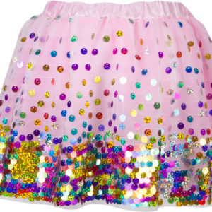 Be the life of the party in this fun multi-coloured sequined skirt. Perfect for days of celebration or for dancing around the house. This soft pink skirt is covered in rows of rainbow sequins and finished with a satin bow at the waist.