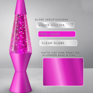 Tweens and teens wake up in their own pink dream world with this Barbie-inspired LAVA lamp! Feel stress melt away while enjoying the dazzling glow of this 14.5″ matte hot pink lamp. The ever-changing, moving silver glitter is soothing to watch as it gently rises up and down in pink liquid. 25 watt light bulb included. Plugs into a power outlet.