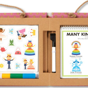 Have royal adventures! The Natural Play princess-themed Play, Draw, Create activity kit offers hours of imaginative, creative play anytime, anywhere! This reusable drawing and magnet activity kit includes a take-along case with rope handles to conveniently store and carry 54 magnets, 5 dry-erase markers with an eraser, a built-in magnetic dry erase board, and a 13-page spiral-bound dry-erase activity book.