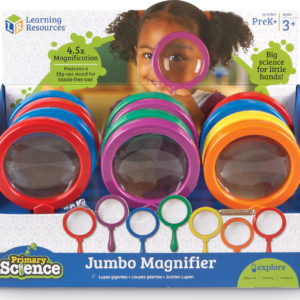 Observe on a grand scale with an extra-large magnifier, sized perfectly for small hands. Ideal for taking a closer look at critters, rocks, fabric, and so much more! Flip-out stands on each magnifier allow for engaged, hands-free viewing. Each magnifier’s plastic lens measures 4.5″ in diameter and offers 4.5x magnification. Magnifiers measure 8″L. Assorted colors include red, orange, yellow, green, blue, and violet. From Learning Resources for grades PreK+ or ages 3+