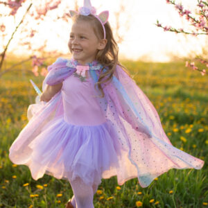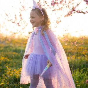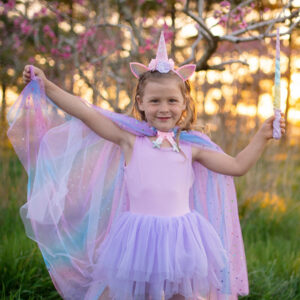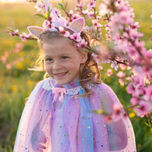 Sparkle and shimmer in our Rainbow Unicorn Cape & Headband set. This pastel-hued cape, embellished with sparkly sequins and silvery trim details, is made complete with a sparkly iridescent unicorn headband with floral accents.