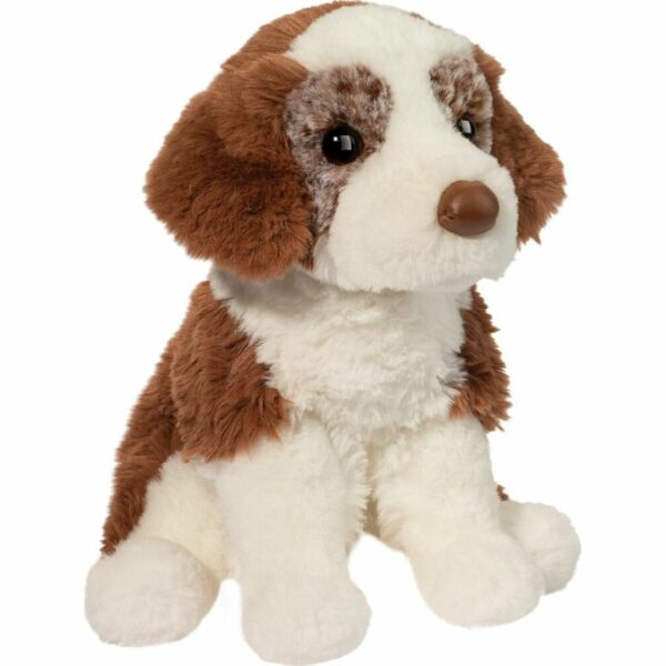 With her bright eyes, perky ears, and vibrant merle-patterned coat in shades of warm brown and cream colors, this plush dog captures the spirited and affectionate nature of the breed.