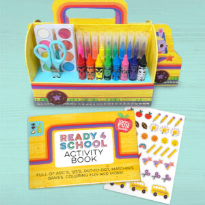 Back to school just got a little bit brighter! We’re loving this colorful school bus caddy filled with art supplies for early learners. Little hands easily unsnap the magnetic closure to reveal washable art supplies (crayons, markers, paints), stickers, scissors, and a 30 page activity booklet filled with ABC’s, dot-to-dots, matching games, coloring fun, and more! Measures 10″ x 12″ x 3″ with a durable handle to take along wherever you wander… or park it on the table for after-school bonding through art!