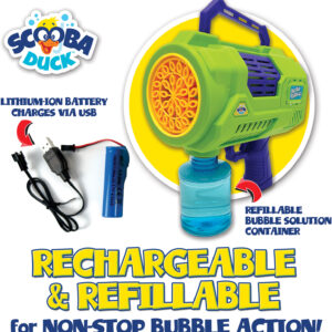 Bye bye batteries, hello endless bubbles! We are obsessed with this super-powered bubble blaster for so many reasons. It’s perfectly sized for little hands, it blows bajillions of continuous hyper-action bubbles, it has a folding carry handle, it’s super powerful, and it’s RECHARGEABLE! Using the included charger, one charge will last for hours of outdoor bubble blasting and popping. The blaster comes with bubbles but you can refill the chamber with any bubble solution. Rechargeable lithium ion battery included.