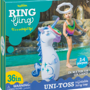 Fling the rings and aim for the sparkly unicorn horn. Who will score the most? The inflatable unicorn has a weighted bottom for stability for land or water play. Includes a 36″ tall inflatable unicorn, two 10″ inflatable rainbow rings and two 10″ inflatable cloud rings. For 2 – 4 players. 5yr+