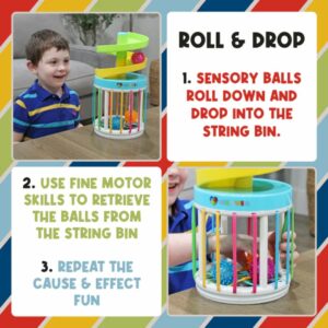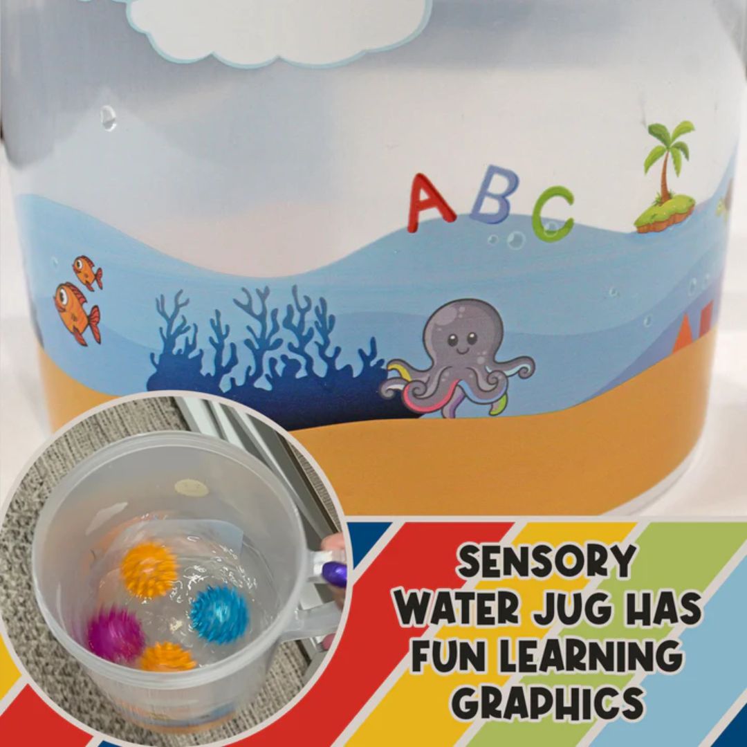 What’s Included: A string bin, water play jug, and a tabletop wobble ramp, accompanied by 3 sensory spiky balls
