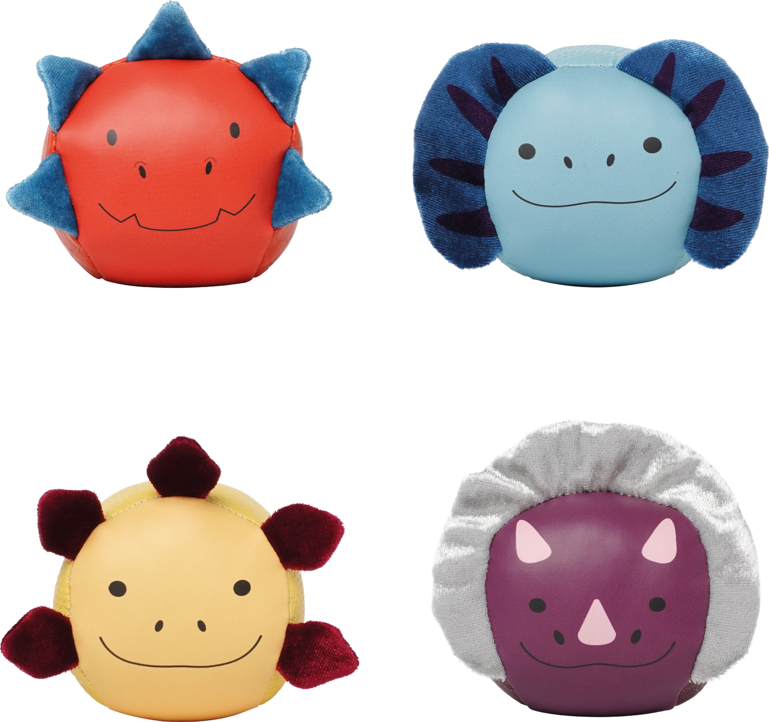- Set of 4 Dino balls: a stegosaurus, a triceratops, a tyrannosaurus and a dimetrodon