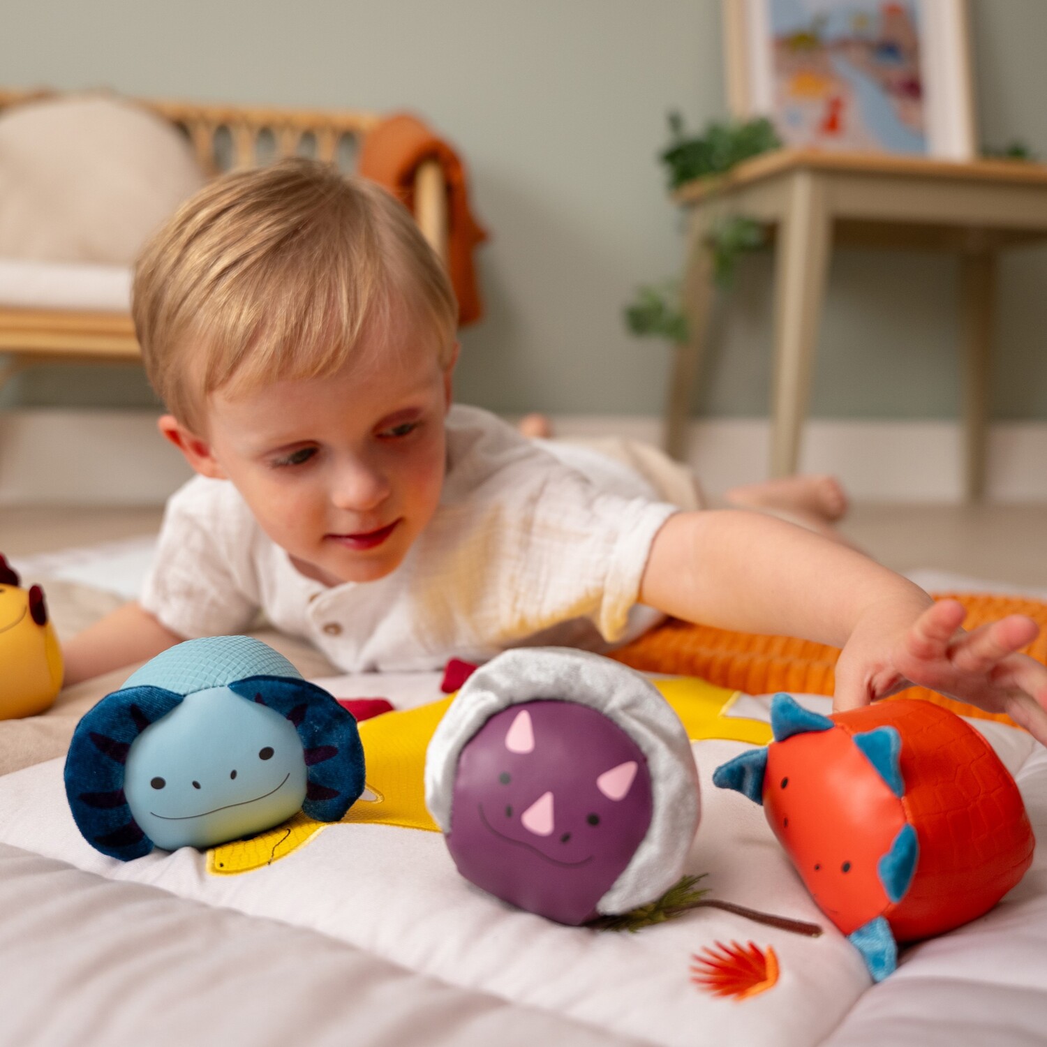 The set of 4 Dino comfort balls includes a stegosaurus, a triceratops, a tyrannosaurus and a dimetrodon that accompany baby in his games. Their round shape makes it easy for little hands to grab them. Their soft and contrasting materials, their cute fabric ears and their internal bell amuse young children and arouse their curiosity. Each cuddly ball makes a different bell sound.