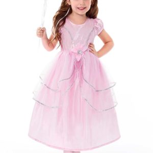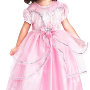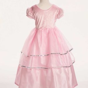 Every princess loves pink! This classic style has a beautiful layered pink skirt. The pink velvet bodice, decorated with silver sequin and accented with a blossomed pink flower, will make any princess feel majestic. Accessories sold separately. Features: Clothing quality fabrics; machine washable. Stretchy, soft and very comfortable. Size S