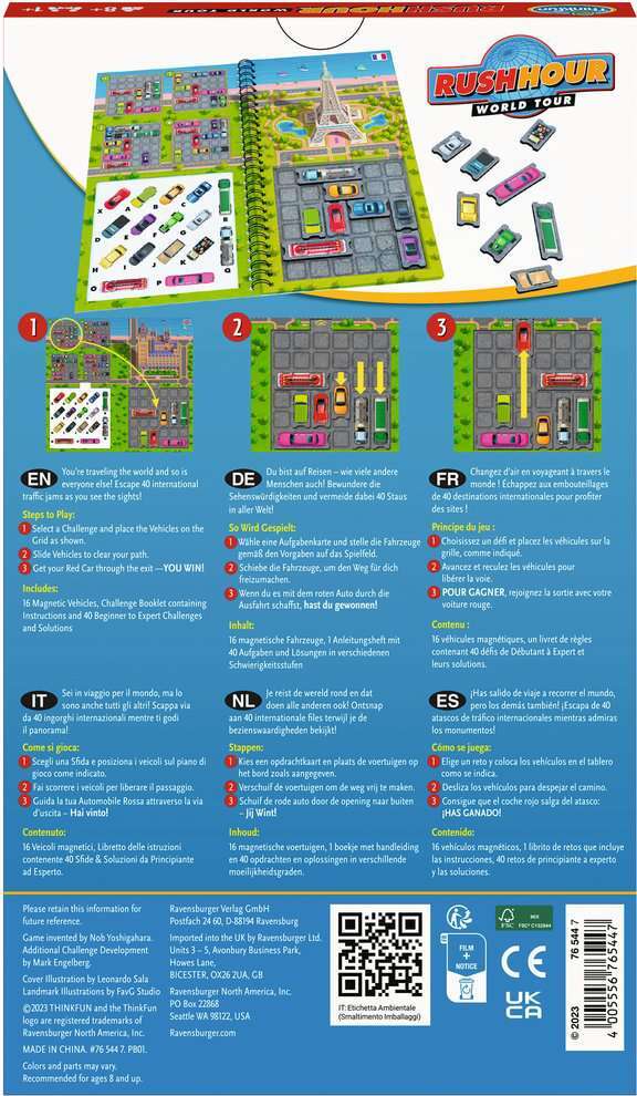 Get ready to embark on a global adventure of logic and strategy, all packed into a compact travel edition that will captivate and challenge you wherever you go. In Rush Hour World Tour MTP, navigate vehicles through bustling traffic jams around the world. Using the power of magnets, solve the traffic jams to slide the red car free to continue to explore the world. This compact edition is designed to join you on your journeys, making it the perfect travel companion as you explore the globe.