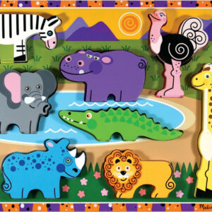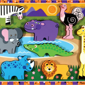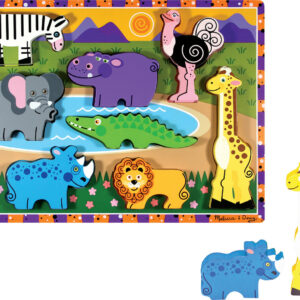African animal favorites are featured on this extra-thick wooden puzzle. Eight easy-grasp, chunky wild-animal pieces have a full-color matching pictures underneath. The animal pieces stand upright for pretend play. Encourages hand-eye, fine motor and creative expression skills.