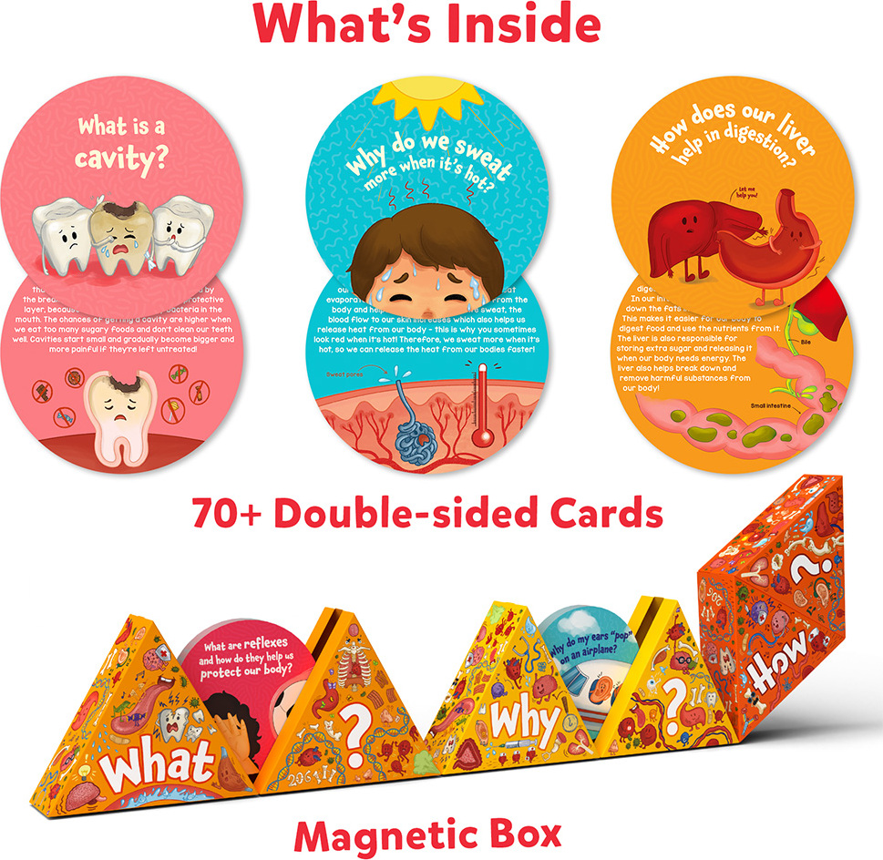- 70+ Double-sided cards with hundreds of fun facts all about the human body
