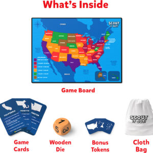 Scout It Out! The 50 States by Skillmatics is a board game packed with maps, facts, flags, and fun! Roll the die to get clues and scout out the correct US state! In this game of rotating clues, be the first player to guess the correct state to win the game card and receive a bonus token to use on the next turn. Think hard, pay close attention to what others say, and make smart guesses. Along the way, players will discover and learn fascinating facts about the USA. The first player to collect 5 game cards wins the game! This simple-to-play game is perfect for an adventurous family game night! For 3-6 players. Ages 7+.
