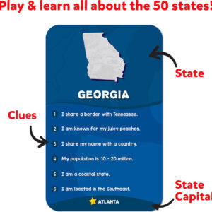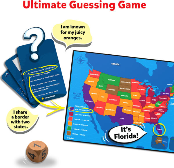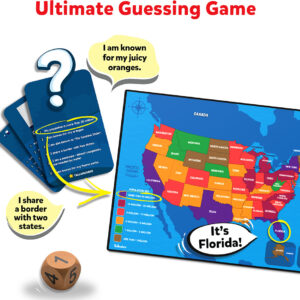 FeaturesDiscover and learn fascinating facts about the USA as you guess to win the US state card! Use the bonus tokens on your turn to make your way to winning 5 cards! The first player to collect 5 US state cards wins the game! Uses observation and listening skills. For 3-6 players.