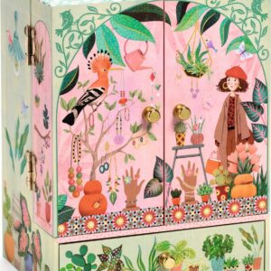 Secret garden is a pretty music box with one large and one small drawer for storing jewelry and secret things in. It also has two ring holders and four golden hooks for hanging necklaces and bracelets. Turn the handle, open the gorgeous box and it comes to life – a delicately carved young girl turns, reflected in a flower-shaped mirror, to the sound of Carl Maria Von Weber’s “Invitation to the Dance”.
