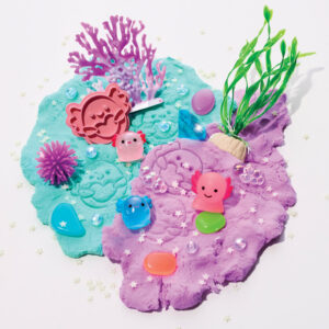Contains 2 colors of soft and stretchy cloud clay, axolotl-themed figurines, squishies, stamps, toys and a variety of fun glow in the dark items to touch and explore.