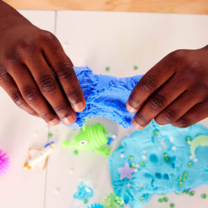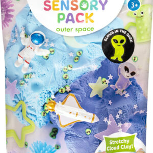 Low-mess sensory activity is perfect for preschoolers & fun for everyone. Contains soft and stretchy cloud clay, glow-in-the-dark alien, figurines, clay stamps, tools and a variety of fun items to touch and explore.