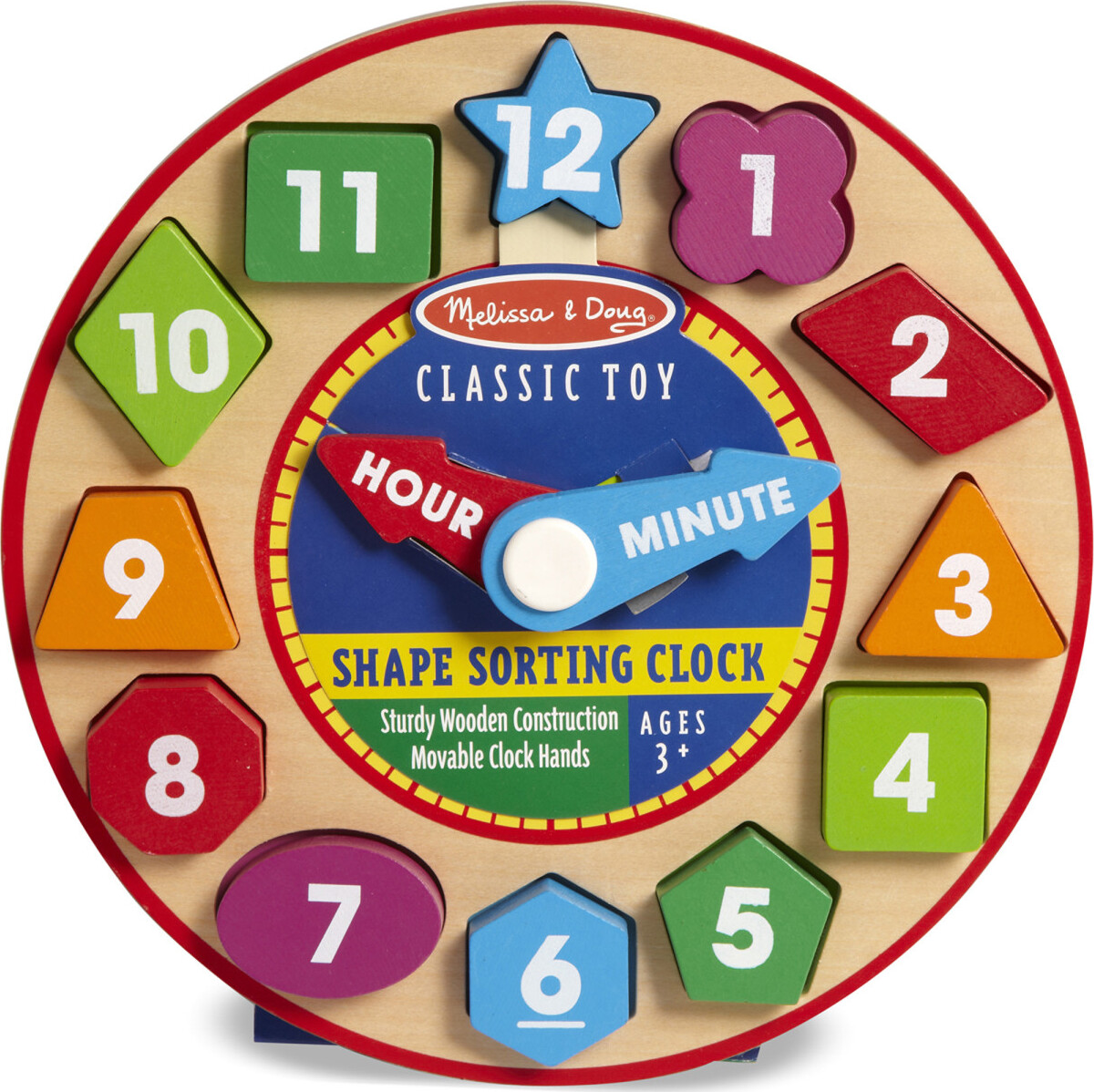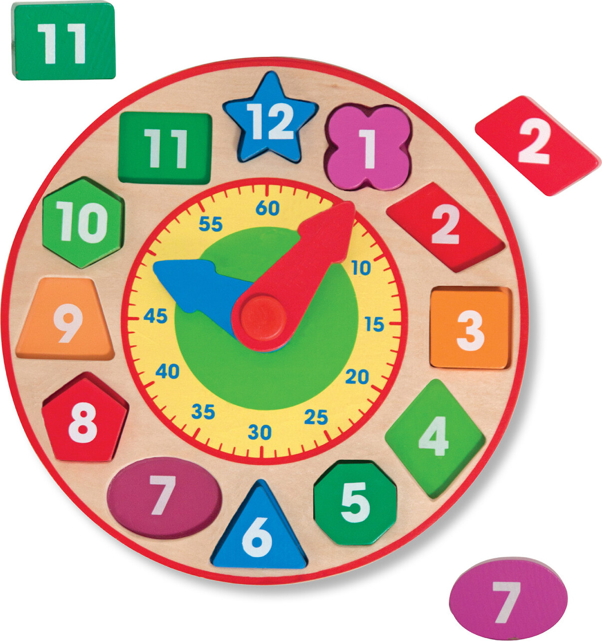 | Features | Wooden clock with 12 removable pieces for teaching time-telling and more Minute and hour hands rotate Teaches fine motor skills, numbers, colors, shapes, and concepts of time |