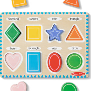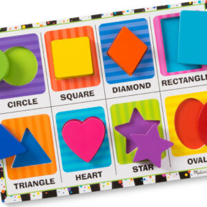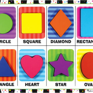 Eight familiar shapes are featured in this extra-thick wooden puzzle with easy-grasp, chunky pieces. Each piece has a matching picture underneath and the shape name is printed on the puzzle board. Encourages hand-eye coordination, fine motor skills and visual perception skills.