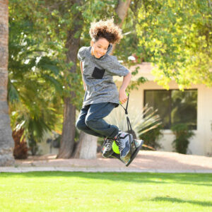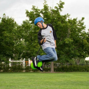 The patented bungee handle construction makes it easier to hold on, balance and do tricks. A heavy duty inflated ball sits in the center to take bouncing to new levels of and PLAY IN THE AIR!