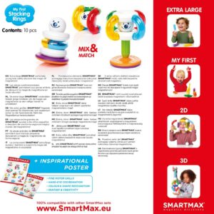 Experience stacking and balancing like never before with My First Stacking Rings! This new take on the classic toy sparks boundless creativity. Watch as magnetic rings split in half and connect in quirky ways, bringing funny figures to life. The dual-sided base introduces a delightful wobble, adding an extra layer of excitement and challenge to your child’s creations. From 1-year-olds to older kids this set stimulates hand-eye coordination, balance, and fine motor skills. My First Stacking Rings seamlessly integrates with other SmartMax sets, expanding your child’s magnetic universe and enhancing their playtime!