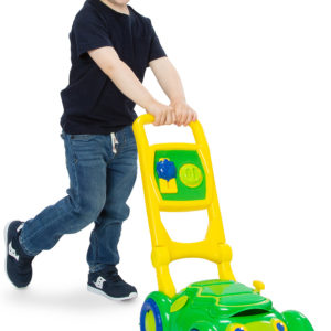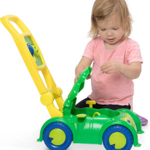 Doing yard work is a snap when the cheerful Snappy Turtle helps! This cleverly designed plastic lawnmower has lots of ways to interest little ones: a storage compartment under the shell, a plastic fuel can to “pour,” dials that turn, slide, and click, and a pull-cord that makes a motor sound! Made from durable materials with Snappy’s smiling face, this is a mower is great for indoor or outdoor play. It’s got a sturdy handle to help new walkers, and will encourage gross motor skill development, role play activities, and an exploration of the natural world. Lock handle in place before giving to child.