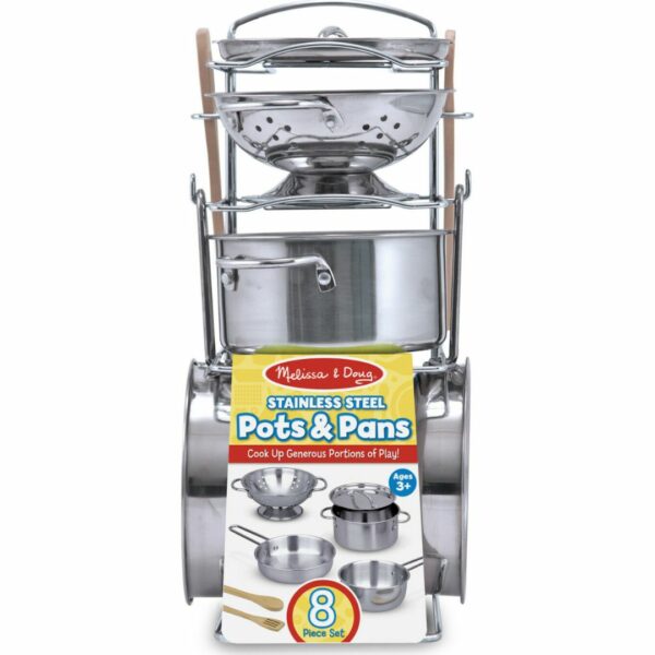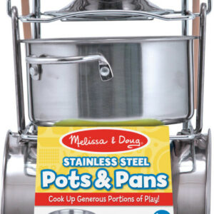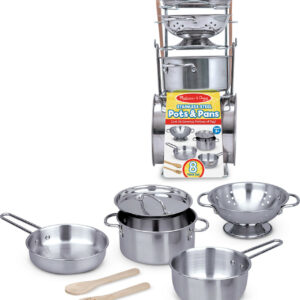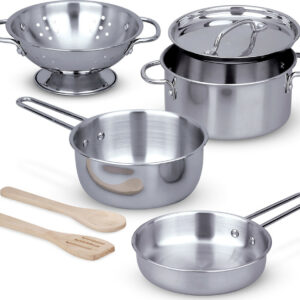 This play set features shiny stainless steel cookware Mom and Dad would envy! Generously sized for a more realistic look and feel, the colander and three pans (with interchangeable lid) fit most play food items for exciting restaurant and kitchen play . . . and store neatly on a convenient storage rack when the kitchen is closed.
