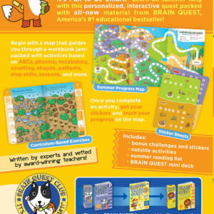 Once you complete an activity, get your stickers and track your progress on the map! Loved by kids, teacher-approved, and parent-trusted, this Summer Brain Quest Workbook also includes bonus challenges and stickers, outside activities, summer reading list, Brain Quest mini deck, and more.