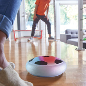 GOOOOAAAALLLL! Enjoy active play indoors even on rainy days! This super soccer ball is shaped more like a UFO and hovers magically over hardwood, laminate, and tile as it’s kicked across the floor. Flashing LED lights illuminate kit fitness without worrying about damaging household items! Play with a partner or solo and try to score the most goals! Includes 2 retractable nets. No need to worry about batteries; rechargable with included USB cord.