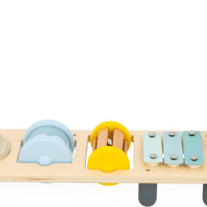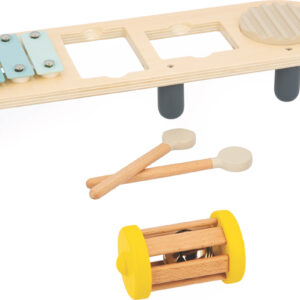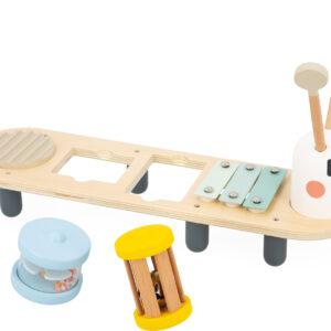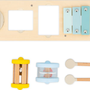 On its back you will find a xylophone and a scratcher in soft colors, as well as 2 removable rattles. The first has 3 bells and the second is a rain stick. Your child can spin them on the base or shake them up and down. This musical stand is ideal for helping your child discover and experiment with different sounds in order to develop their hearing acuity. FSCTM certified wooden musical toy. For children aged 18 months and over.