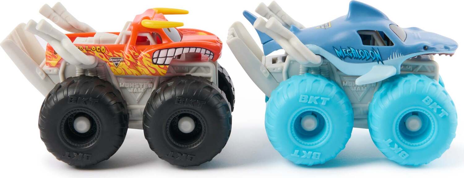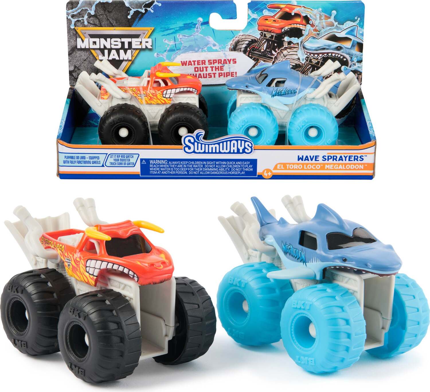 Create monster waves with some of Monster Jam’s most iconic trucks! Water sprays out the exhaust pipe of these big-wheeled toy trucks as kiddos zoom them across the surface of the water – no batteries required. This 2-pack of El Toro Loco and Megalodon brings stunt-filled water play thrills for any young fan. They’re made for everyday play, bathtime entertainment, lake vacations, epic summer pool parties, and swim training, as they inspire kids to unknowingly strengthen their swimming skills. When not in water, these trucks are also fun for imaginative play on land!