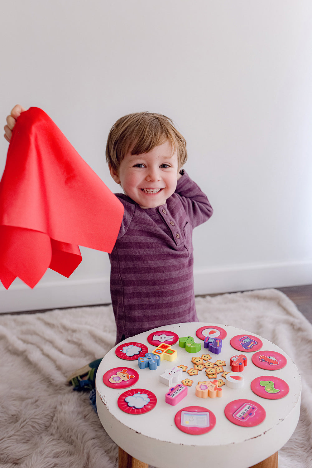Sharpen your preschooler’s observation skills with a fun new memory game! Players take turns being the “magician”, covering all 10 wooden objects with the magic scarf and pulling an item out. The other players race to determine which item is missing by looking at the corresponding image tiles. The first player to correctly identify the missing object gets a star token, and the player with the most stars at the end of the game wins. Make it more challenging by flipping the tiles over after the items are found, making it harder to remember what all the objects are! For 3-5 players.