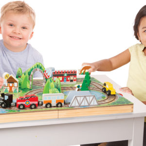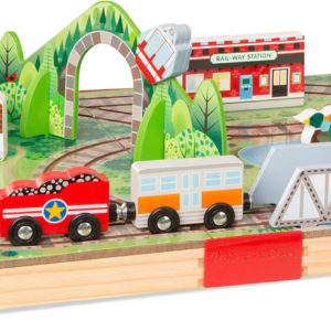 Built-in tracks, colorful scenery, and fun play pieces let kids take their imaginations for a spin… and take playtime anywhere they want to go! Unfold the sturdy wooden case to create an illustrated play surface with built-in train and road tracks for the three wooden wheeled trains and a park ranger vehicle. Set up a bridge and a mountain tunnel with a gondola that slides across the top! Wooden play pieces include buildings, animals, trees, and a railroad crossing sign to enhance imaginative storytelling. All the pieces store in the fold-up case with convenient carrying handle for easy cleanup and travel (there’s plenty of room to add other toys, too!). Keep playtime rolling for kids three and older and encourage independent play and motor skill development.