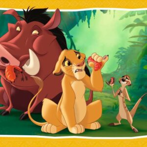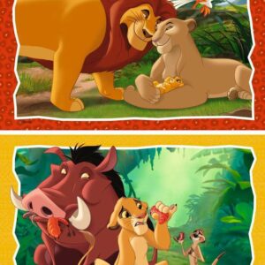 Give your little Disney fan hours of calm, screen-free play with our pair of puzzles from the beloved “The Lion King” animated movie! One scene features Mufasa and Sarabi welcoming their new cub Simba while Zazu watches over them. The second shows Simba when he first meets Pumbaa and Timon, deciding if he is hungry enough to eat a grub which he declares to be “Slimy, yet satisfying!” Puzzles help develop hand-eye coordination, fine motor skills and problem-solving through repeated practice!