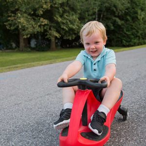 The sleek, innovative design of The Original PlasmaCar features a patented safety seat, polypropylene wheels, and is kid powered-kid approved! Sit with both feet on the footrests, turn the steering wheel and away you go. Turn and navigate in small spaces indoors, and ride outdoors on sidewalks, pathways, and any other safe, smooth, flat surface. The award-winning PlasmaCar is easy to operate, and helps your child develop coordination, balance, and motor skills while harnessing the natural forces of inertia, centrifugal force, gravity, and friction. PlasmaCar is adult-friendly too: it doesn’t require an expensive power source that needs constant replacement, it provides kids with plenty of exercise, and it is quiet – the only sound you’ll hear is the sound of the wheels. Safe for up to 220 lbs. Instructions included. Assembled: 31″ x 14″ x 16″.