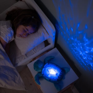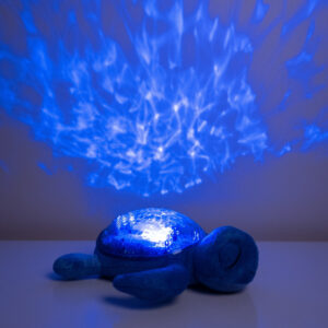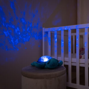The Tranquil Turtle Aqua is a calming night light that projects ocean waves onto the ceiling and plays soothing sounds. Its soft glow and plush material make it a comforting companion for babies and young children at bedtime.